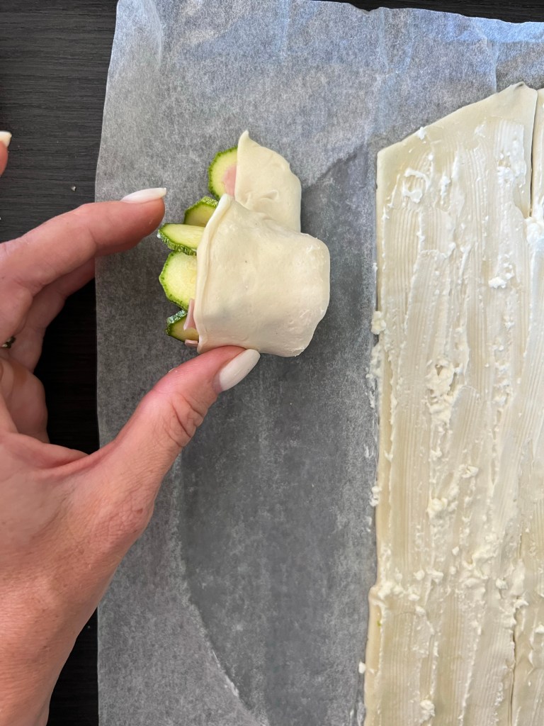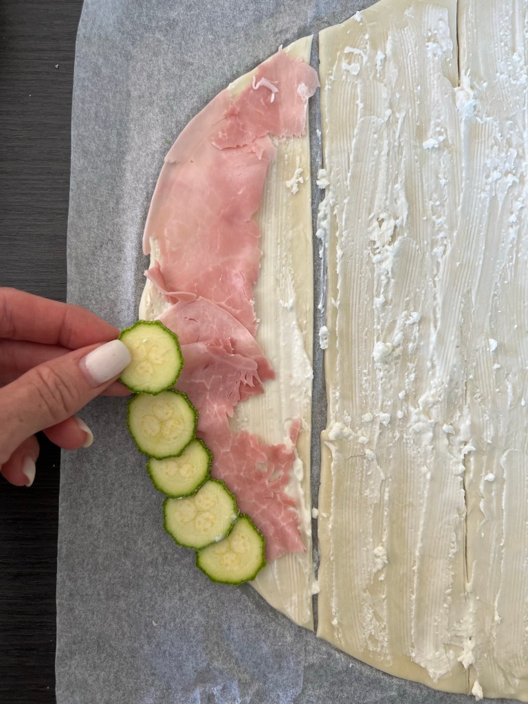 Su ogni striscia adagiate del prosciutto cotto e sul bordo le fettine di zucchine.