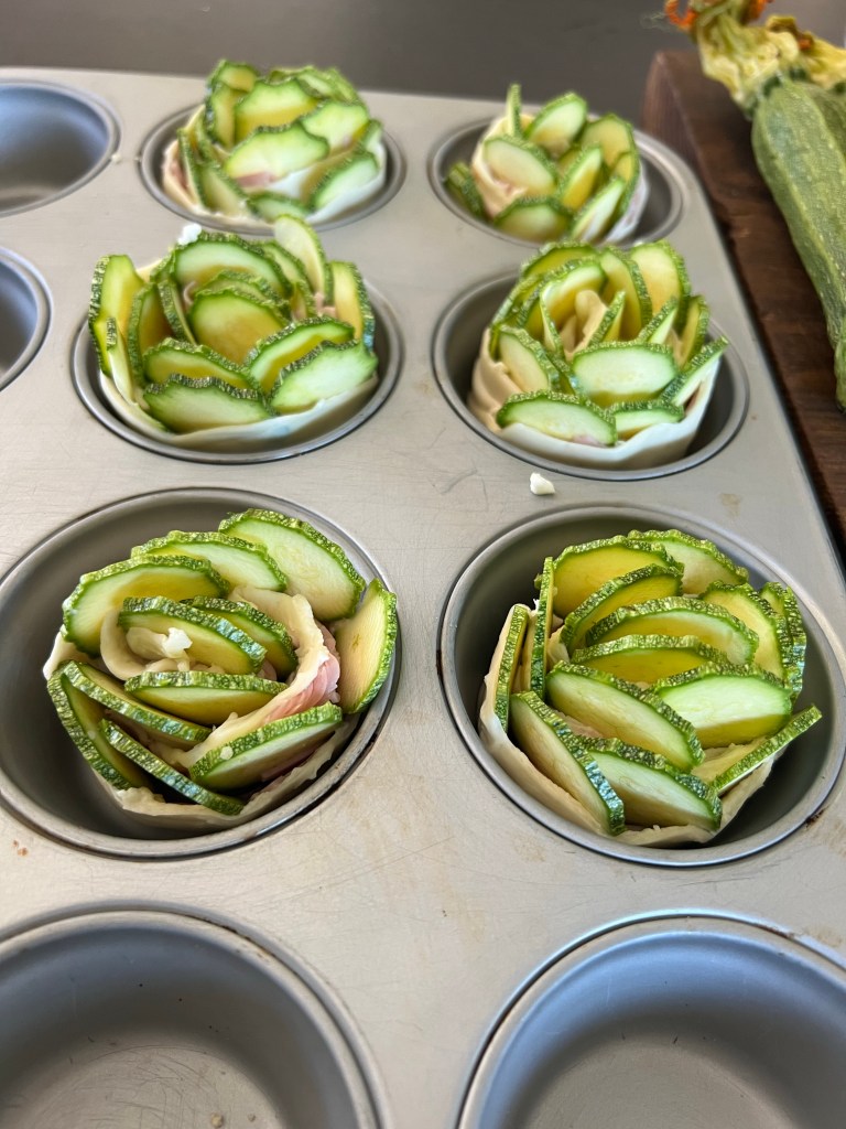 Sovrapponete una parte di sfoglia sull’altra e arrotolate formando la vostra rosa che andrete a posizionare dentro il pirottino della teglia da muffin.