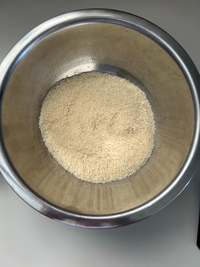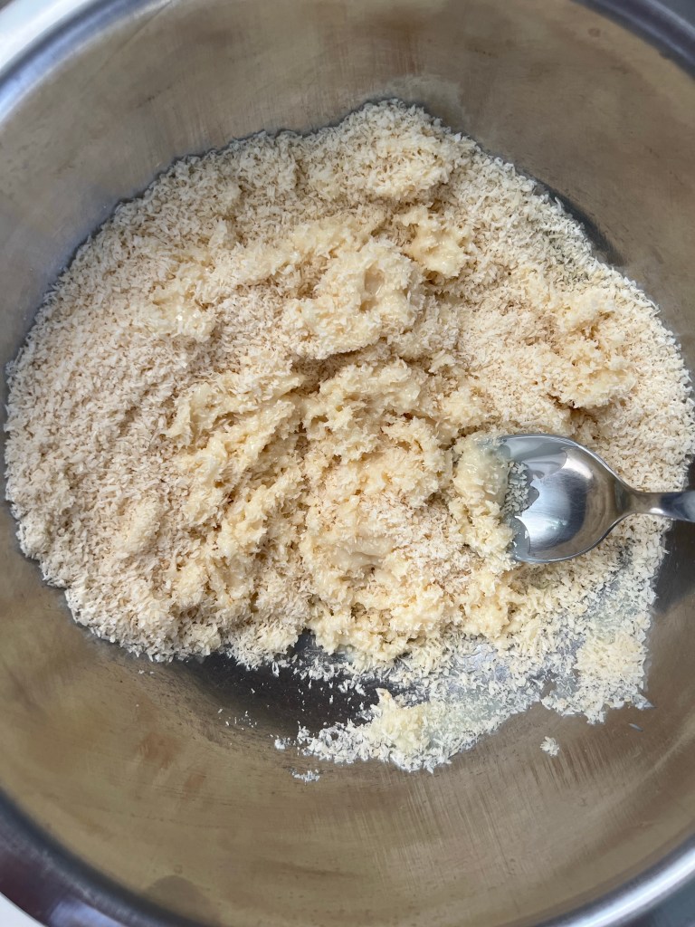 Prendete il cocco rapè e versatelo in una ciotola. Aggiungete il latte condensato e mescolate con una spatola. Aggiungete un pizzico di sale e mescolate ancora rendendo il tutto ben compatto.