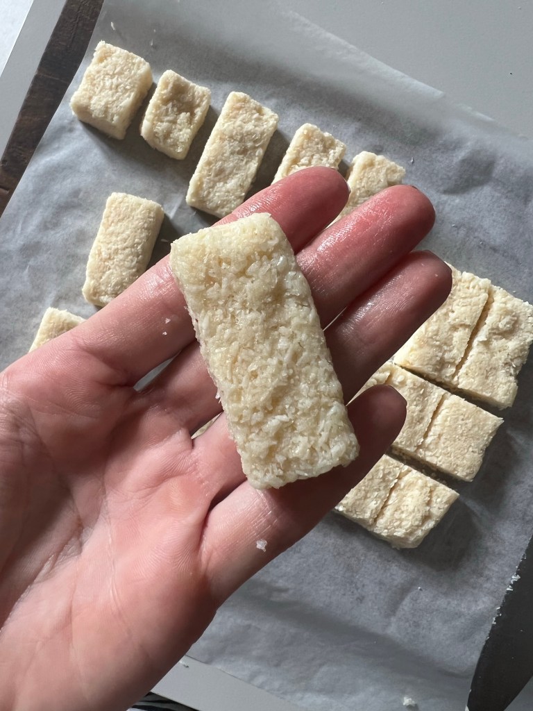 A questo punto riprendete il composto dal frigo. Dovrà essere bello compatto e duro , e con un coltello dividetelo in parti uguali in modo da ricavare delle barrette. Prendetene una alla volta e modellatele leggermente con le mani in modo da smussare gli angoli