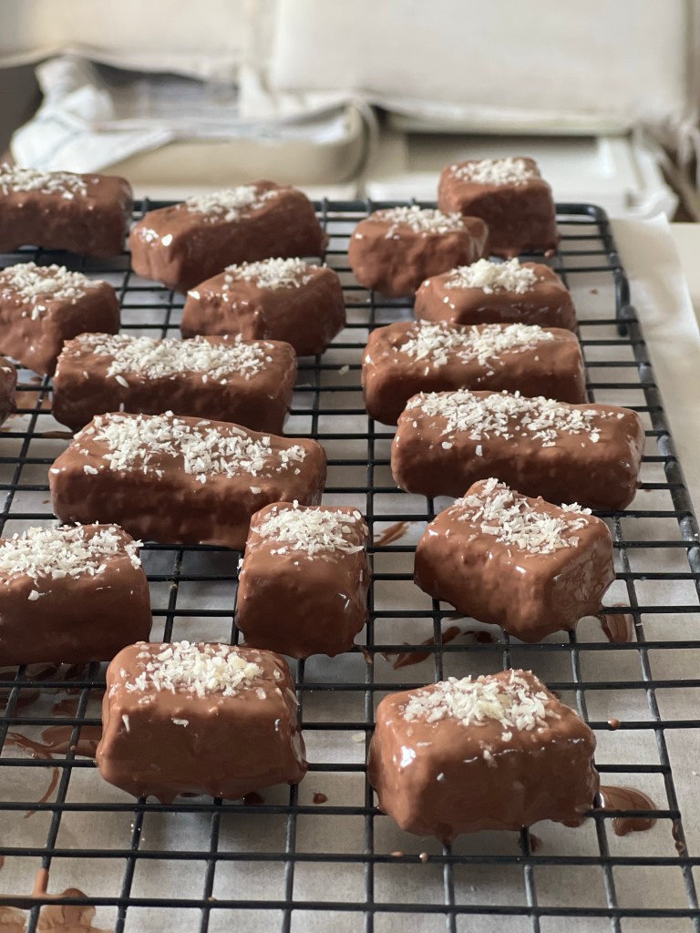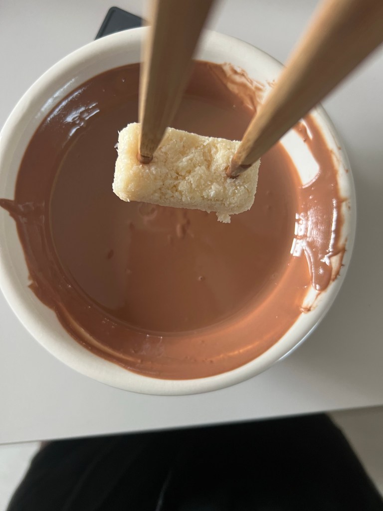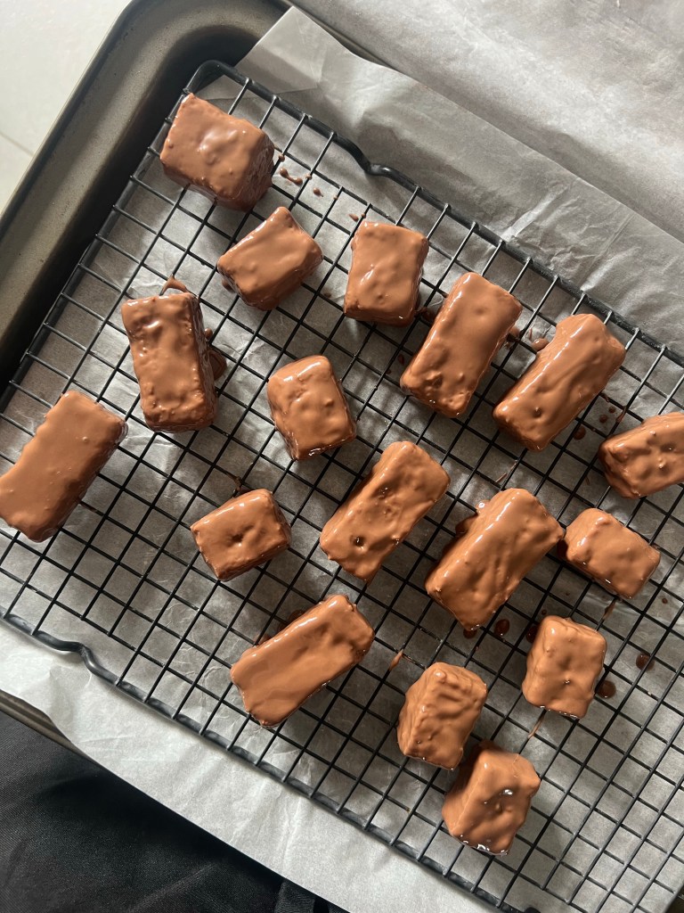 Fate rapprendere il cioccolato che non dovrà essere caldo e non appena avrà raggiunto la giusta temperatura immergete all’interno una delle barrette aiutandovi con una forchetta. Eliminate il cioccolato in eccesso lasciandolo cadere nella ciotola prima di sistemare , mano mano sulla gratella le barrette