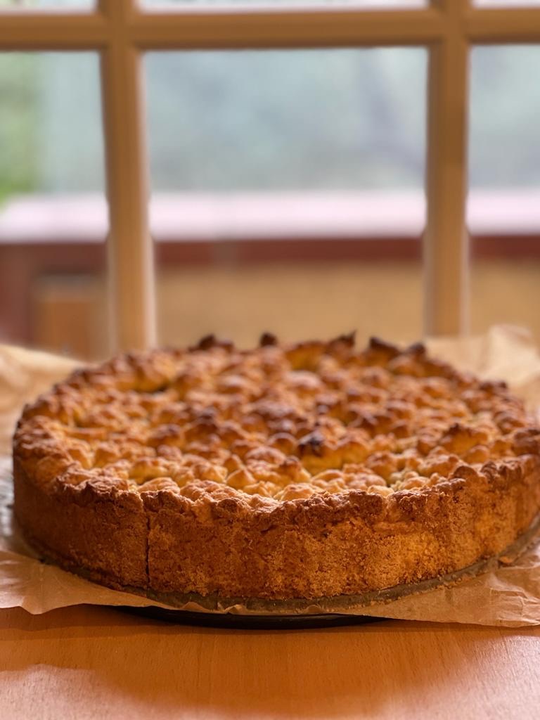 Prendete la teglia e rivestite la base con la carta da forno. Versate dentro circa metà dell’impasto sbriciolone e schiacciatelo leggermente facendo anche i bordi della vostra torta. Versate dentro un po’ di marmellata di albicocche , le mele precedentemente tagliate. Aggiungete ancora delle cucchiaiate di marmellata e coprite il tutto con la frolla sbiciolata. La copertura non deve essere perfetta .